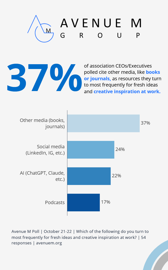 At first glance, it might seem surprising that traditional sources—books and journals– still lead the pack in an era defined by instant digital access. But, the poll reveals something deeper about how today’s professionals spark creativity: The best ideas often come not from what’s newest, but from where our minds slow down long enough to think differently.